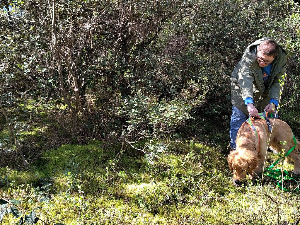 En pratique du côté du maître: il observe les changements de comportement de son chien, ainsi que l’environnement. Il est attentif à la gestion de sa longe pour perturber le moins possible l’analyse olfactive, le déplacement et le travail de son chien. Le propriétaire suit le déplacement de son binôme canin. Il gère aussi les réactions de son chien face aux différentes distractions. Il peut le soutenir ou l’aider, si cela est nécessaire ou pertinent.